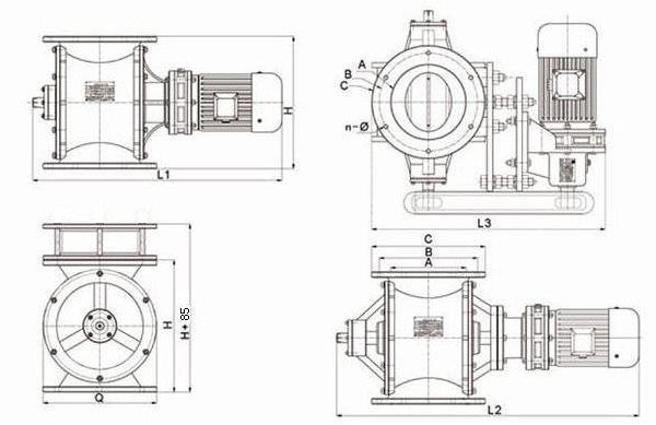 | 型號 | A | B | C | H | Q | L1 (內(nèi)) | L2 (外) | L3 (鏈) | n-Ф | 工作溫度 ℃ | 轉(zhuǎn)速 轉(zhuǎn)/分 | 電機(jī)功率KW |